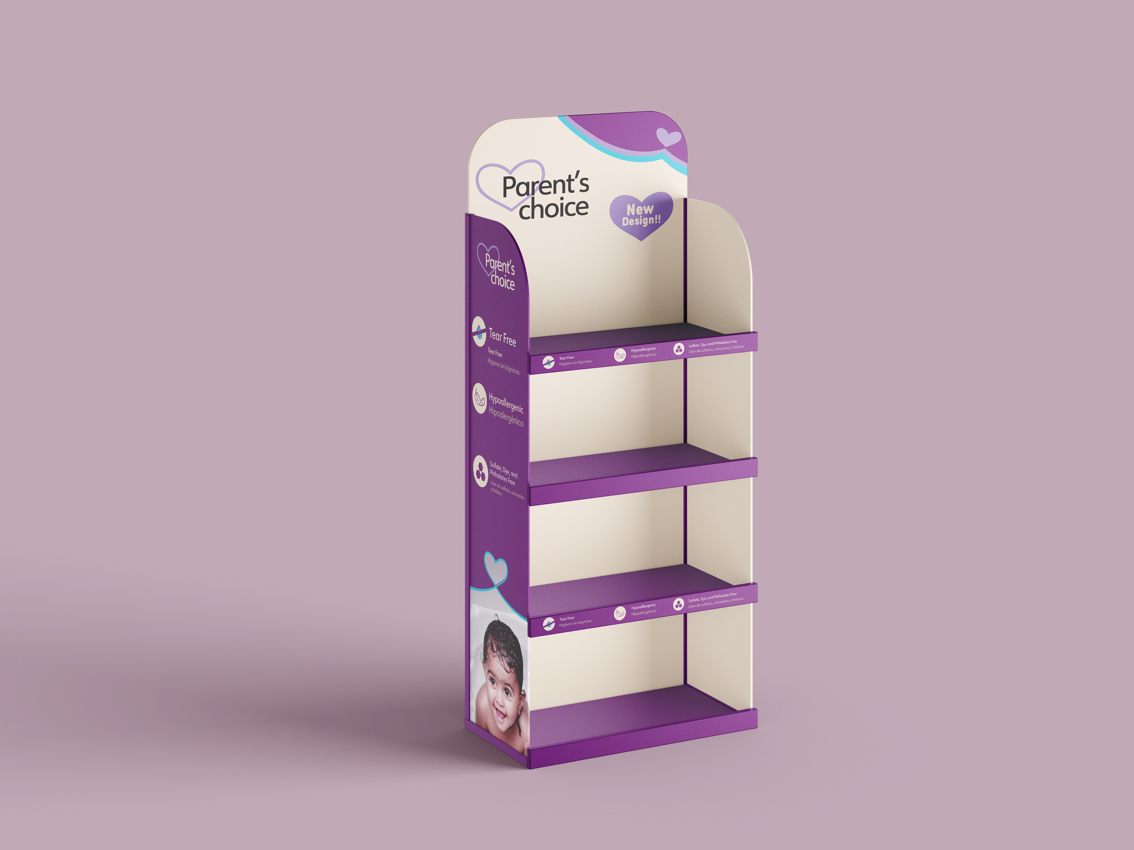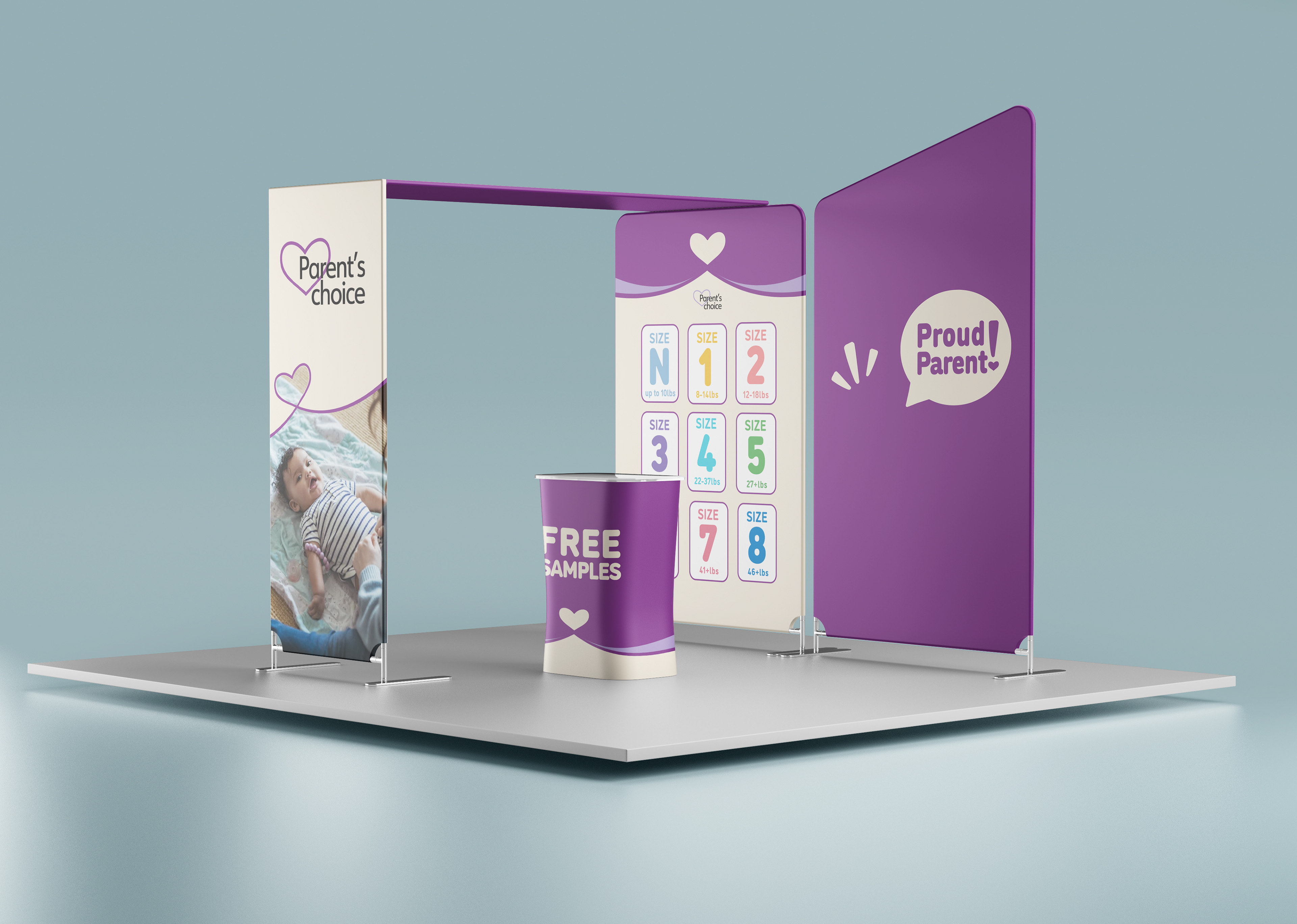 The pop-up exhibit engages parents through an immersive brand experience, while the accompanying diaper size guide poster reinforces clarity and usability by presenting essential product information in a simple, easy-to-understand format.